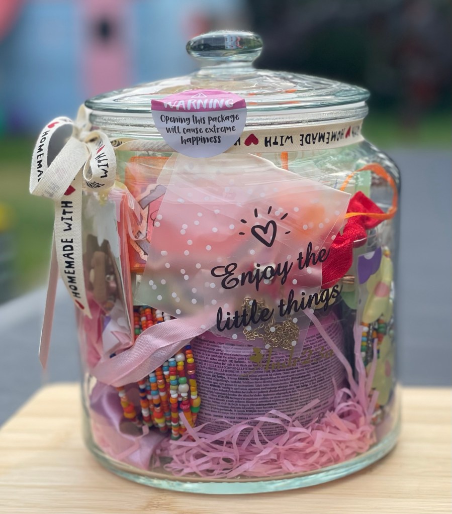Unwrap happiness with this giant glass jar packed with over 20 little treasures designed to brighten your day! Each jar is carefully curated with: