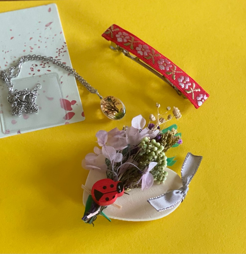 The Roots bag includes a fridge magnet with evergreen flowers and a wood ladybug, a folk inspired hair barette and a chain necklace with glass charm.