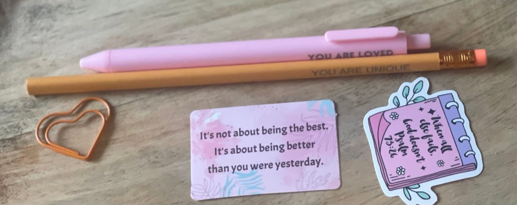 ✍️ One motivational pen – because words of hope are always worth writing. 🖍️ One motivational crayon – bringing color and encouragement to even the hardest days. 💌 A sticker with a Bible verse – a gentle reminder of faith and comfort. 🌟 An affirmation card – daily words of strength and positivity to carry with you. 💜 A small paper clip – shaped like love, because even the smallest things can hold us together. 🎀 A delicate pink bow – a symbol of awareness, unity, and the fight against cancer.